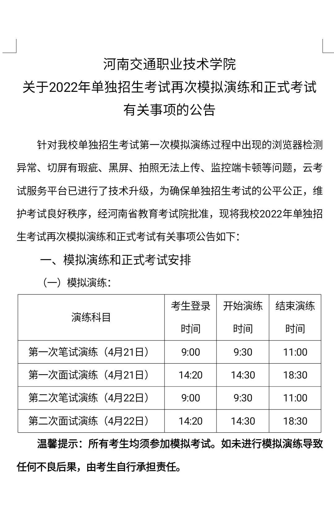 河南交通职业技术学院关于2022年单独招生考试再次模拟演练和正式考试有关事项的公告