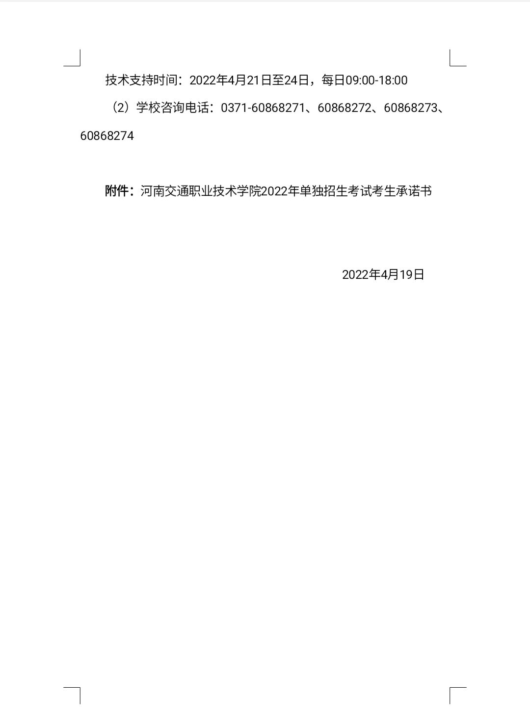 河南交通职业技术学院2022年单独招生考试考生承诺书.doc