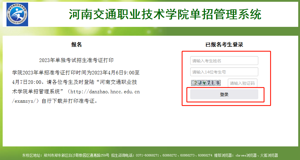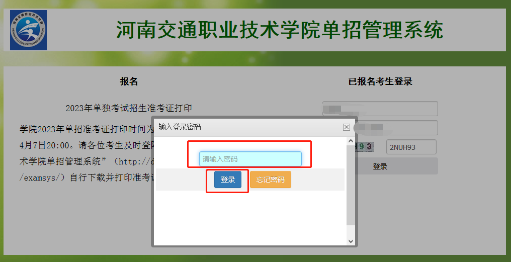 已报考我院的考生在右侧登录区域输入姓名、考生号、验证码,然后点击登录。