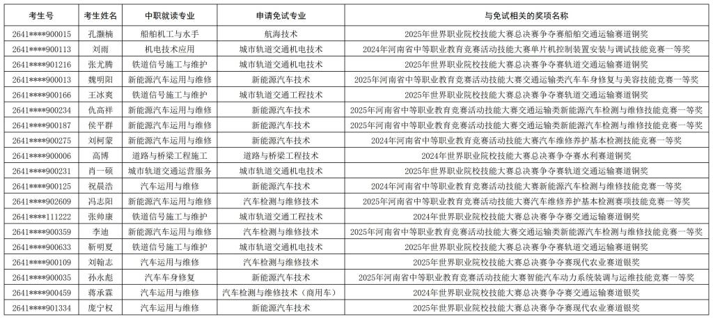 根据《河南省教育厅关于做好2026年高等职业教育单独考试招生和技能拔尖人才免试入学工作的通知》(教学〔2026〕34号)的相关要求,我校对考生提交的技能拔尖人才免试申请材料进行了严格审核,并将审核结果提交至河南省教育厅备案。经审核,共有19名考生符合免试入学条件。现将符合条件的考生名单予以公示。